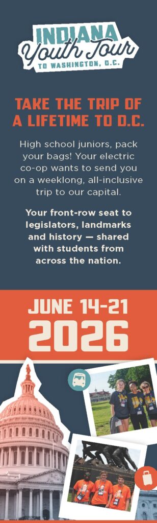 South Central Indiana REMC (SCI REMC) participates in the Indiana Rural Electric Youth Tour to Washington, D.C., allowing local teenagers to visit our nation’s capital and learn about the government and electric cooperatives. While in Washington, Youth Tour delegates visit landmarks such as Arlington National Cemetery, Capitol Hill, the U.S. Supreme Court, Lincoln, Jefferson, and Vietnam memorials, and several museums. On Capitol Hill, Indiana’s delegation will visit with their local Congressman and take a tour of the Capitol Building that includes a visit to the U.S. House of Representatives Gallery.