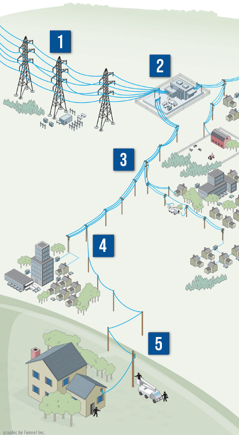 Electricity does not travel directly from your pole to your house. Instead, it travels a long path that starts at power plants where electricity is generated. From there, it moves through transmission lines, substations, distribution lines, and tap lines before finally reaching your home. Because of this long path, restoring power requires crews to repair problems in order, from the beginning of the line to the end.